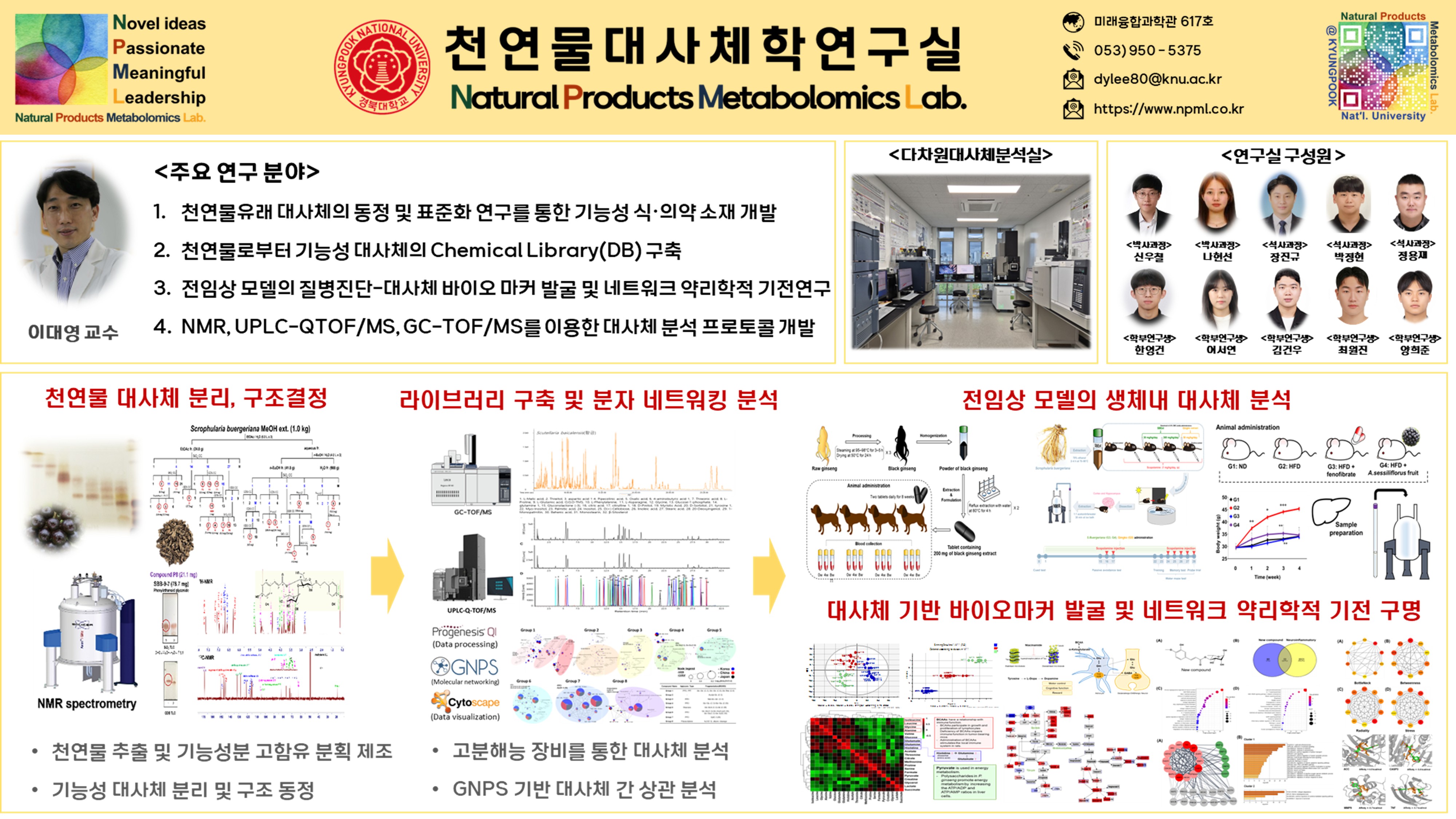 × 이대영 교수 Lee, Dae Young 전공 천연물대사체학 최종학력 이학박사, 경희대학교 연구실미래융합과학관 617호 연락처053-950-5375 이메일dylee80@knu.ac.kr 연구실 홈페이지 담당 교과목 생물화학 1, 2 유기화학 1, 2기기분석학 천연물화학 및 실험 연구분야 천연물대사체학 식물대사공학Molecular NetworkingNetwork Pharmacology 목록 이전글최동규 24.06.18 다음글유지승 24.06.18
